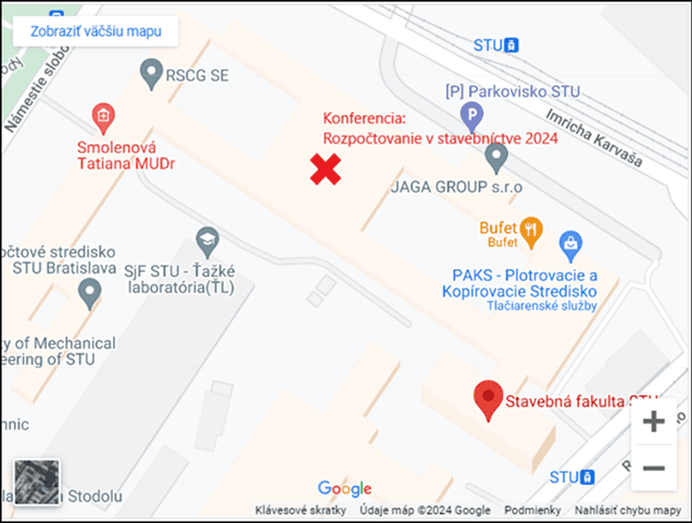 Stavebná fakulta STU, AULA na prízemí budovy, cesta do miestnosti bude od vrátnice (hlavného vchodu z ulice Imricha Karvaša) označená smerovými šípkami.