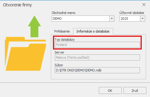Pre stiahnutie správneho inštalačného súboru prosím skontrolujte, aký typ databázy využívate. Túto informáciu nájdete pri spustení programu v prihlasovacom formulári v časti Informácie o databáze.