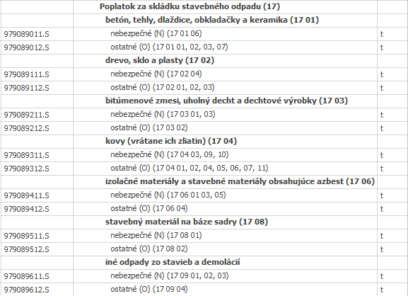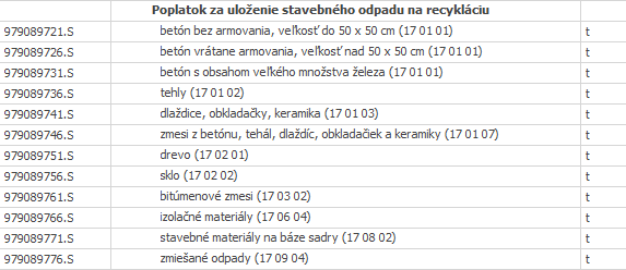Poplatok za uloženie stavebného odpadu na recykláciu sa oceňuje nasledujúcimi položkami z cenníka 801-3 Búranie a podchytávanie konštrukcií: